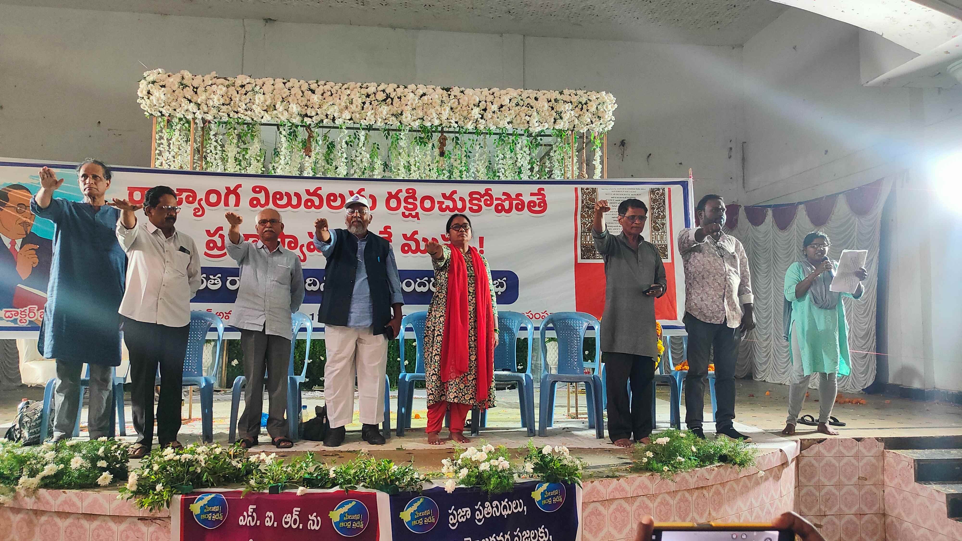 The central theme of the program was “Endangers to Humanity if the Constitution is Not Protected.” Several distinguished speakers addressed the gathering, including Prof. Anjaiah from Acharya Nagarjuna University, V. S. Krishna from the Forum for Human Rights, Dr. Ravi Kumar, a state leader of JVV, Md. Subhan and Ramesh from Meluko Andhra Pradesh, and Smt. Subbayamma, a noted social activist.